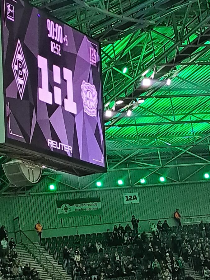 Anpfiff 20:30 Uhr: Die ersten Minuten war’s ungewohnt still, die Fans protestierten schweigend. Danach aber: typische Gladbach-Atmosphäre, so glaube ich. Leipzig hatte zwar mehr Ballbesitz, aber vorne fehlte die Durchschlagskraft. Gladbach spielte clever auf Konter und stand hinten stabil. Ein Tor von Franck Honorat wurde wegen hauchdünnem Abseits zurückgenommen – leider hab ich’s verpasst, weil ich gerade Wasser holen war. Pech gehabt. Kurz darauf knallte David Raum den Ball nur an die Latte.